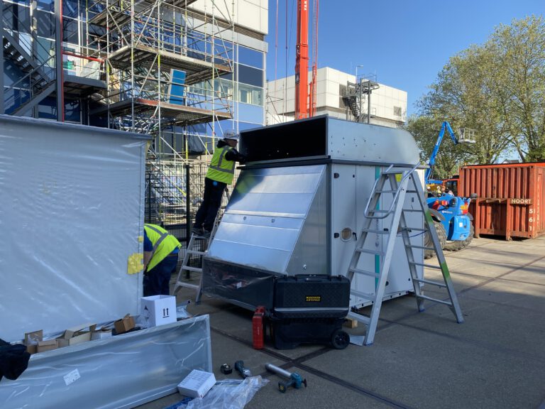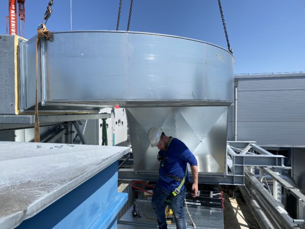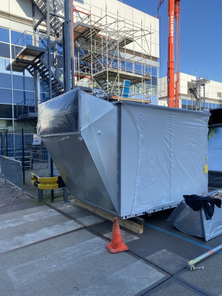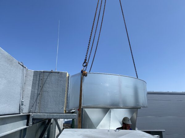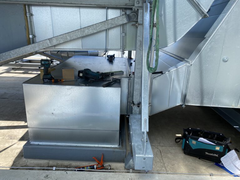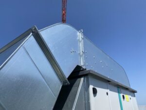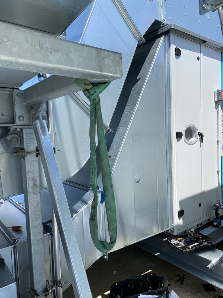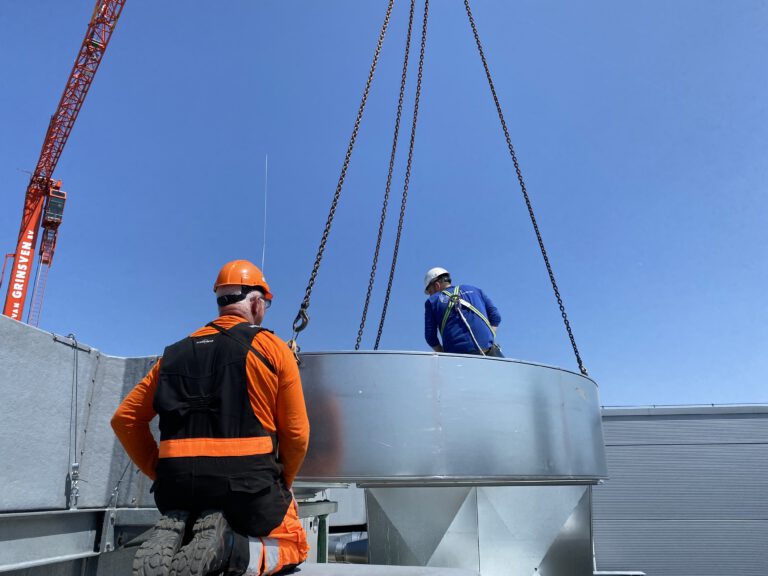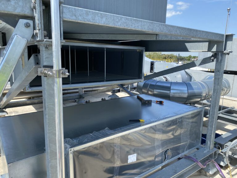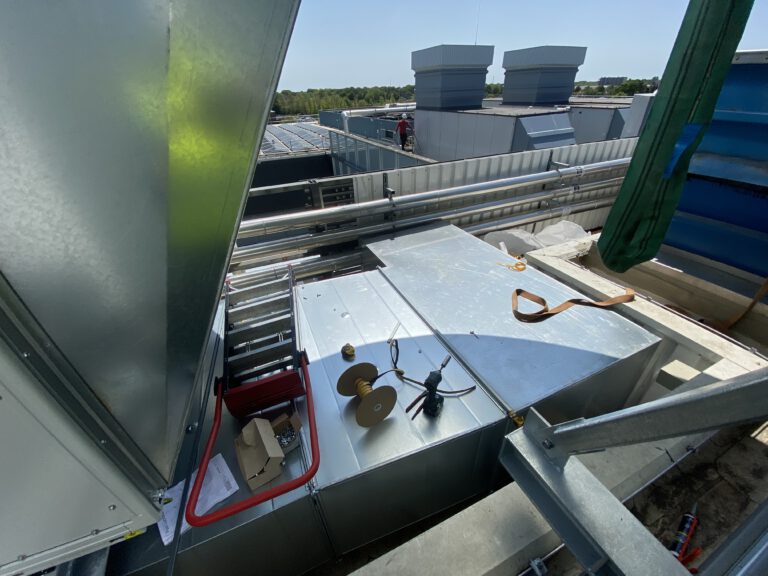 De nieuw geïnstalleerde Systemair boosterfans versterken de luchtverversing, naadloos gekoppeld aan de bestaande dakkanalen.